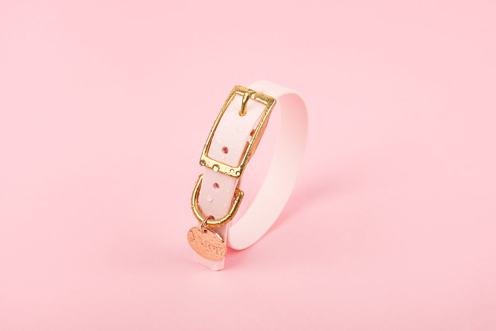 They are handcrafted from waterproof plastic webbing and beautiful metal hardware. If the collar and leash get dirty or wet, just rinse them under warm water and soap—they'll look brand new again! Oh, and did we mention? They are also odor-free, so they don't stink!