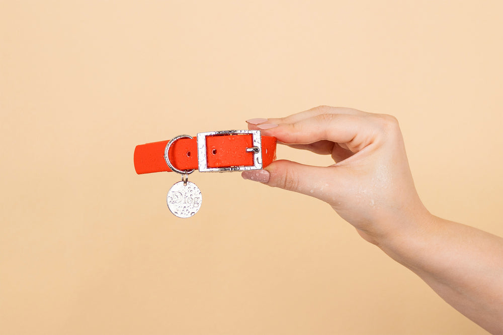 They are handmade from waterproof plastic webbing, and beautiful metal hardware. If the collar gets dirty or wet, just rinse it under warm water and soap-and it will look brand new again! Oh and did we mention? They are also odor free, which means that they do not stink!